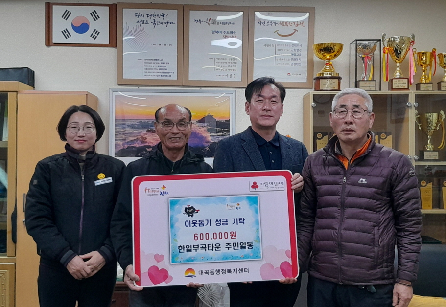 | 한일부곡타운 주민 일동은 1월 22일 대곡동 행정복지센터를 방문해 이웃돕기 성금 60만 원을 전달했다.