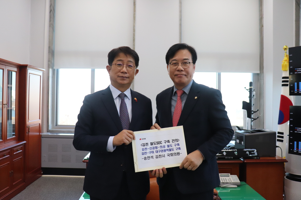 | 송언석 국회의원(국민의힘, 경북 김천)이 국회에서 박상우 국토교통부 장관을 만나, ‘김천~신공항~의성 철도’와 ‘김천~구미 대권광역철도’ 구축 등 새롭게 추진 중인 김천 철도SOC 구축사업 추진을 위한 건의서를 전달했다.