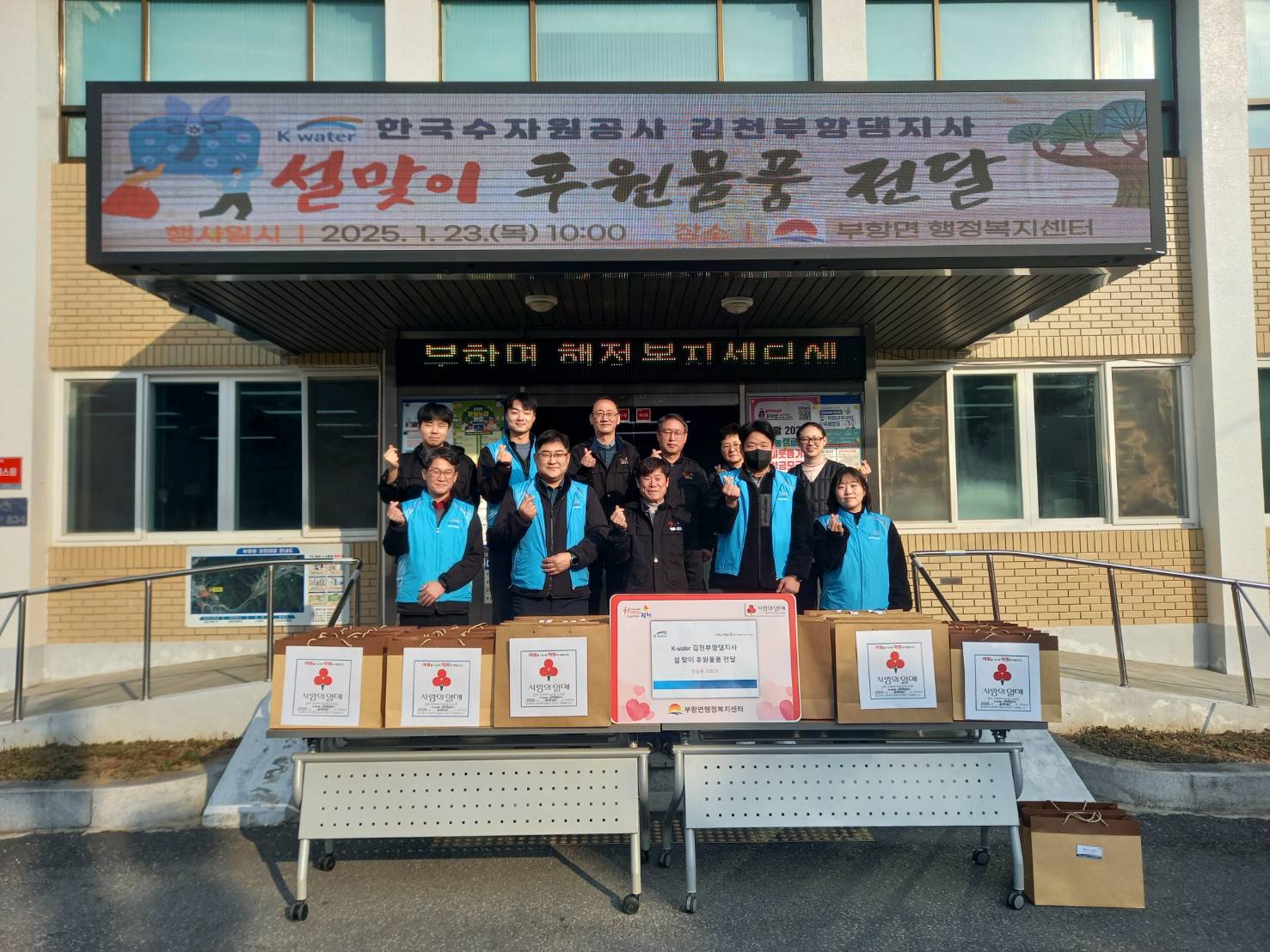이번 후원 물품은 김천부항댐지사 직원들이 자발적으로 매월 급여의 일정액을 기부하는 물사랑 나눔펀드를 통해 정성껏 모은 것으로, 겨울나기가 어려운 부항면 저소득 취약 가구에 전달하여 따뜻한 설 명절을 보내는 데 도움을 줄 예정이다.