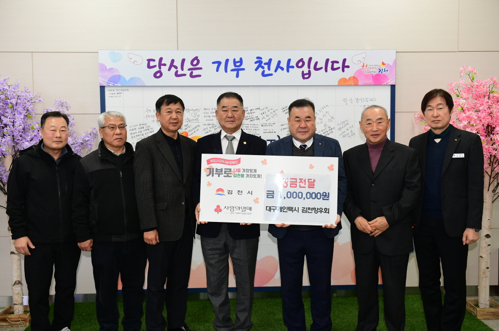 | 김천시는 지난 1월 23일 김천시 대구개인택시 김천향우회(회장 최명상)로부터 이웃돕기 성금 100만 원을 전달받았다고 밝혔다.