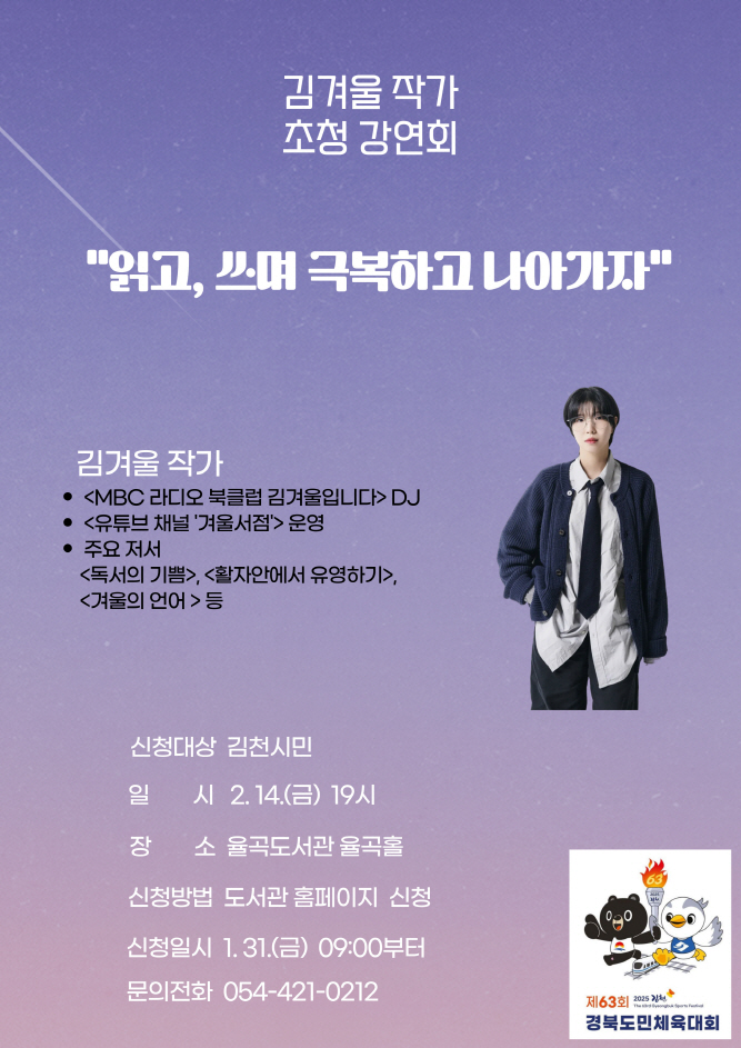 | 김천시립율곡도서관(관장 이순영)은 2월 14일 율곡도서관 율곡홀에서 김겨울 작가를 초청해서 강연회를 개최한다. 이번 강연은 김천시민을 대상으로 하며, ‘읽고 쓰며 극복하고 나아가기’라는 주제로 진행된다.