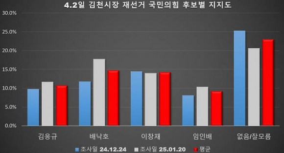 |  | | | ⓒ 김천내일신문 | | 사진 왼쪽부터(가나다순) 김응규, 배낙호, 이창재, 임인배 국민의힘 예비후보/사진제공=예비후보 선거사무소 여론조사 상위권 예비후보들의 공약을 살펴보면 배낙호 예비후보는 김천 상무 FC 대표를 거쳐 김천시의회 3선 의원으로 활동하면서 6대와 7대 의회에서 의장을 역임했다. 그는 △스마트 물류 허브 조성 △우수 공공기관 유치 △관광산업 활성화 △홍보·전시성 예산 삭감 등을 핵심 공약으로 내세우며, 준비된 후보로서 강력한 추진력을 강조하고 있다. 이창재 예비후보는 경북도 감사관, 김천시 부시장을 역임했다. '소통하는 김천시'를 강조하며 △국책사업 국비 예산 확보 △교통산업 거점도시 육성을 통한 인구 20만 명 시대를 목표를 핵심 공약으로 발표했다. 김응규 예비후보는 시·도의원 4선을 지내고 경북도의회 의장을 역임했다. 그는 "시민의 목소리에 귀 기울이고 규정과 원칙을 지키며 성장하는 김천을 만들겠다"는 포부를 피력하고 있다. 임인배 예비후보는 국회의원 3선을 역임한 중진 정치인으로, 풍부한 국정 경험을 바탕으로 김천 발전을 이끌겠다는 입장이다. 모노리서치(2024년12월26일) 조사는 유·무선전화 ARS 조사 방식으로 진행했으며 표본오차는 95% 신뢰수준에 ±4.4%p, 전체 응답률은 4.7%다. 여론조사공정(2025년1월20일) 조사는 무선 ARS 전화조사 방식으로 진행했으며 표본오차는 95% 신뢰수준에서 ±4.4%p, 전체 응답률은 12.2%로 나타났다.