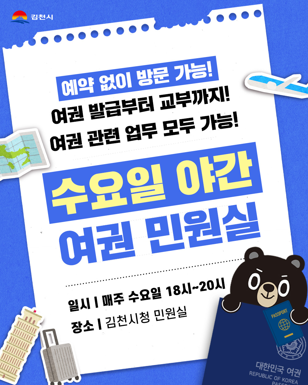 | 김천시는 오는 2월 5일부터 매주 수요일 오후 6시부터 8시까지 ‘수요일 야간 여권 민원실’을 운영한다고 밝혔다.