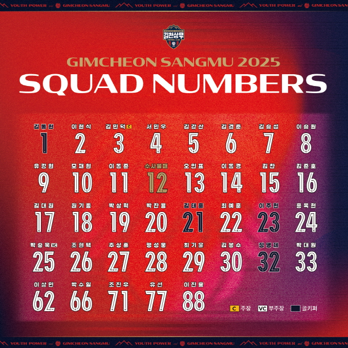 포지션에 어울리는 등번호도 눈에 띈다. 공격수 트리오 김승섭 7번, 유강현 9번, 모재현 10번이 눈길을 끈다. 또한, 김천상무 서포터즈 ‘12번째 전사 수사불패’의 배번은 어김없이 12번이다.