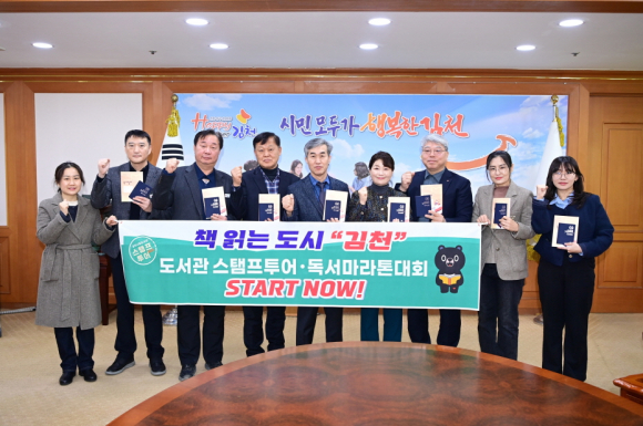 | 김천시는 지난 2월 4일 시청 접견실에서 책 읽는 도시 분위기를 확산하기 위한 「2025 도서관 스탬프투어」와 「2025 독서마라톤대회」의 희망찬 출발을 알렸다.