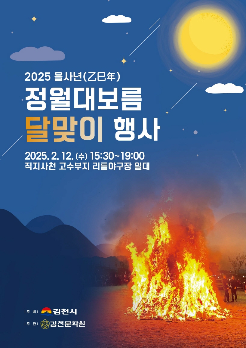 시 관계자는 “우리 고유 명절인 정월대보름 행사를 통해 을사년, 뱀의 해를 맞아 한 해의 건강과 안녕, 그리고 김천시의 발전을 기원하는 시민 대화합의 장이 되기를 바란다.”라며 “많은 시민이 함께 참여해 뜻깊은 시간을 보내시길 기대한다.”라고 전했다.