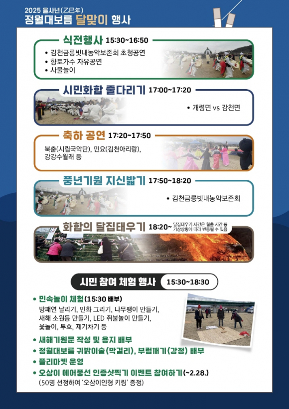 사전 행사는 15시 30분부터 김천금릉빗내농악보존회의 국가무형유산 빗내농악 공연으로 시작된다. 이어지는 사물놀이와 향토 가수 공연이 시민들의 흥을 돋울 예정이다. 본행사는 17시부터 개령면과 감천면의 시민 대화합 줄다리기를 비롯해 시립국악단 대북 공연, 강강수월래, 지신밟기 등 다채로운 전통 공연으로 이어진다. 특히 올해는 뱀띠 가족들이 함께 참여하는 강강수월래와 점화식이 특별 행사로 마련되어 눈길을 끈다.