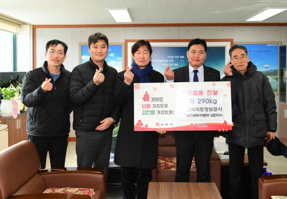 | 김천시는 지난 2월 5일 한국국토정보공사 대구경북지역본부 김천지사(지사장 현병준)으로부터 백미 290kg(70만 원 상당)을 전달받았다고 밝혔다.