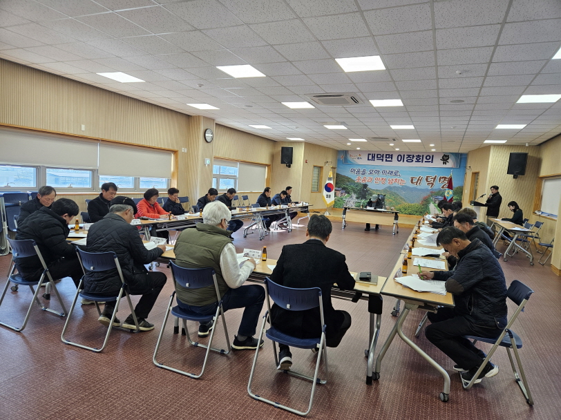 | 대덕면(면장 홍영기)은 2월 11일 행정복지센터 3층 회의실에서 행정의 원활한 추진과 지역 현안 사항 해결을 위한 이장회의를 개최했다. 이번 회의에서는 겨울철 한파와 강설에 대한 안전 대비와 봄철을 앞두고 당면한 행정과 영농의 효율적 추진을 위하여 각 농가에 실질적으로 도움을 줄 수 있는 정보들과 방안들에 대하여 논의하고 소통하는 시간을 가졌다.