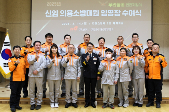 | 김천소방서(서장 안영호)는 2월 14일 김천소방서 대회의실에서 신임 의용소방대원 임명장 수여식을 개최했다.