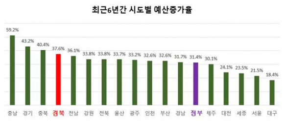 |  | | | ⓒ 김천내일신문 | 경북도 예산이 지난 6년간 3조 6,263억원(37.6%)* 증가한 것으로 나타났다. 이 같은 증가율은 같은 기간 정부예산 증가율 31.4%보다 6.2%P 높고, 광역지자체 평균 예산 증가율 32.3%를 크게 웃도는 수치다. * 차세대 지방재정관리시스템> 통합예산개요 2020~2025년 본예산 기준