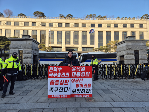 | 송언석 국회의원(국민의힘, 경북 김천)은 2월 17일 헌법재판소 앞에서 헌법재판소의 정치적 편향성을 규탄하며 1인 시위를 진행했다. 송 의원은 "헌법재판소가 법과 원칙을 저버리고, 국가 운영의 중대한 사안에 대해 편향적 판단을 내리고 있다"며 강한 우려를 표명했다.
