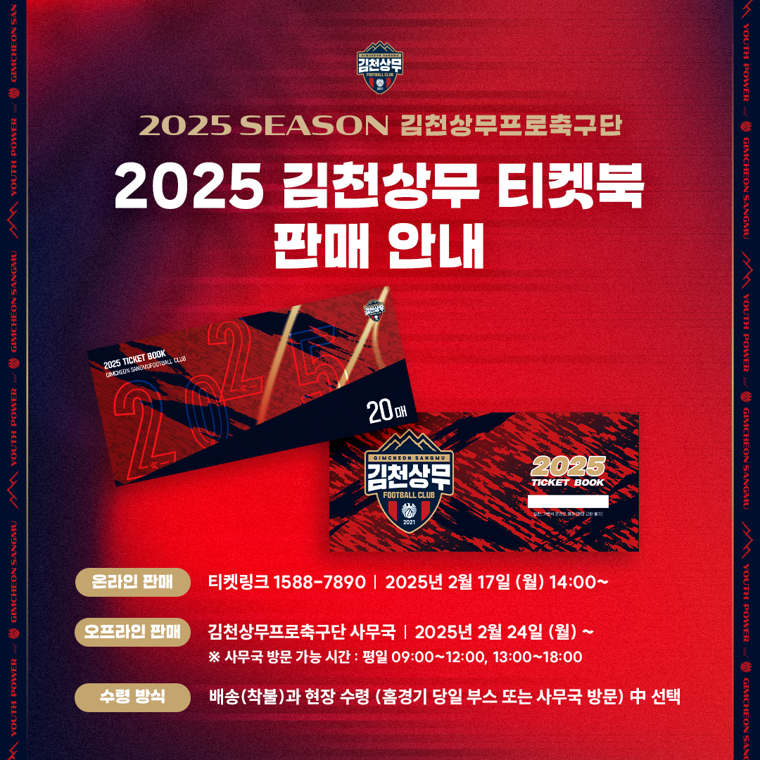 티켓북 1권당 가격은 13만 원으로 정가 대비 50%가 할인된 금액이다. 티켓북은 2025시즌 김천상무의 홈경기 예매가 가능하며, 1권당 20번까지 예매할 수 있다. 온라인 예매 시 티켓북 내의 난수번호를 입력해 사전 예매할 수 있다. 실물티켓 발권 시에는 장당 1,000원의 예매수수료가 발생하며, 2025시즌 내 미사용 티켓북은 환불이 불가하다. 이외의 유니폼, 티켓북에 관한 자세한 사항은 사무국(070-4105-1138)에 전화 문의할 수 있다. 한편, 김천상무는 2월 22일 제주SK와 ‘하나은행 K리그1 2025’ 2R 원정경기를 치른다.