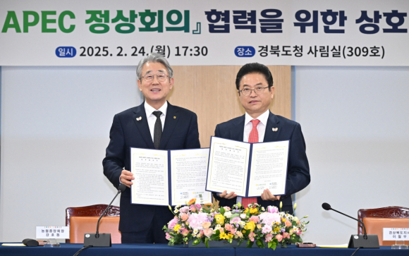 | 경상북도는 2월 24일 경북도청에서 이철우 경상북도지사와 강호동 농협중앙회장이 ‘2025년 APEC 정상회의 성공개최를 위한 업무협약’을 체결했다.