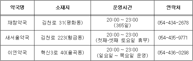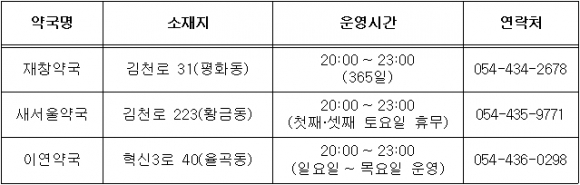 | 김천시는 시민들의 심야시간대 의약품 구매 접근성을 높이기 위해 3월부터 공공심야약국 3개소를 지정‧운영한다고 밝혔다.