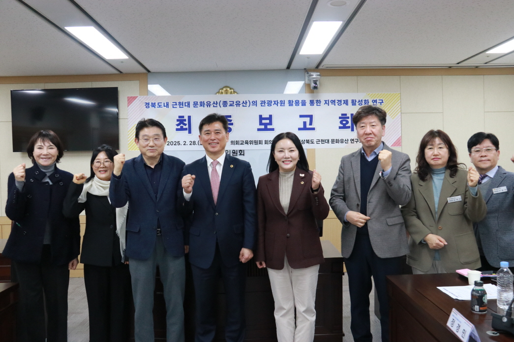 | 경상북도의회 의원연구모임인 「근현대 문화유산 연구회」(대표 김대일 의원)는 2월 28일 도의회에서 “경북도내 근현대 문화유산(종교유산)의 관광자원 활용을 통한 지역경제 활성화 방안 연구”의 최종보고회를 성료했다.