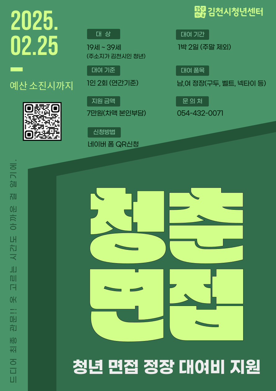 | 김천대학교(총장 윤옥현) 산학협력단(단장 윤경식)은 취업을 준비하는 청년들을 위해 김천시 청년센터에서 2025년 면접정장 대여비 지원사업을 첫 시행 한다고 밝혔다. 이번 지원사업은 청년들의 경제적 부담을 덜어주고, 취업 준비에 실질적인 도움을 주기 위해 마련됐다.
