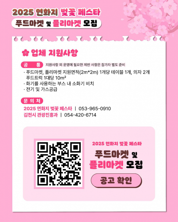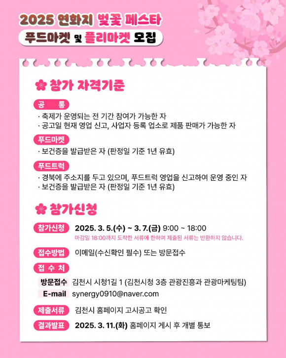 | 김천시는 3월 29부터 4월 6일까지 9일간 개최 예정인 『2025 연화지 벚꽃 페스타』푸드·플리마켓 참여업체를 3월 5일(수)부터 3월 7일(금)까지 모집한다고 밝혔다.