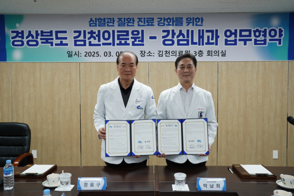 | 김천의료원과 대구 강심내과(원장 박남희, 한성욱)는 지난 3월 5일 심장내과 진료 협약을 체결하였다.