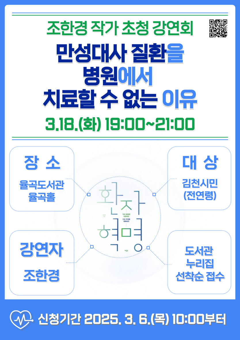 | 김천시립 율곡도서관(관장 이순영)은 오는 3월 18일 저녁 7시, 유명 건강 저서 『환자혁명』의 저자 조한경 작가를 초청해 ‘만성대사 질환을 병원에서 치료할 수 없는 이유’를 주제로 질병 예방과 치료의 성공적인 방향을 제시할 예정이다.
