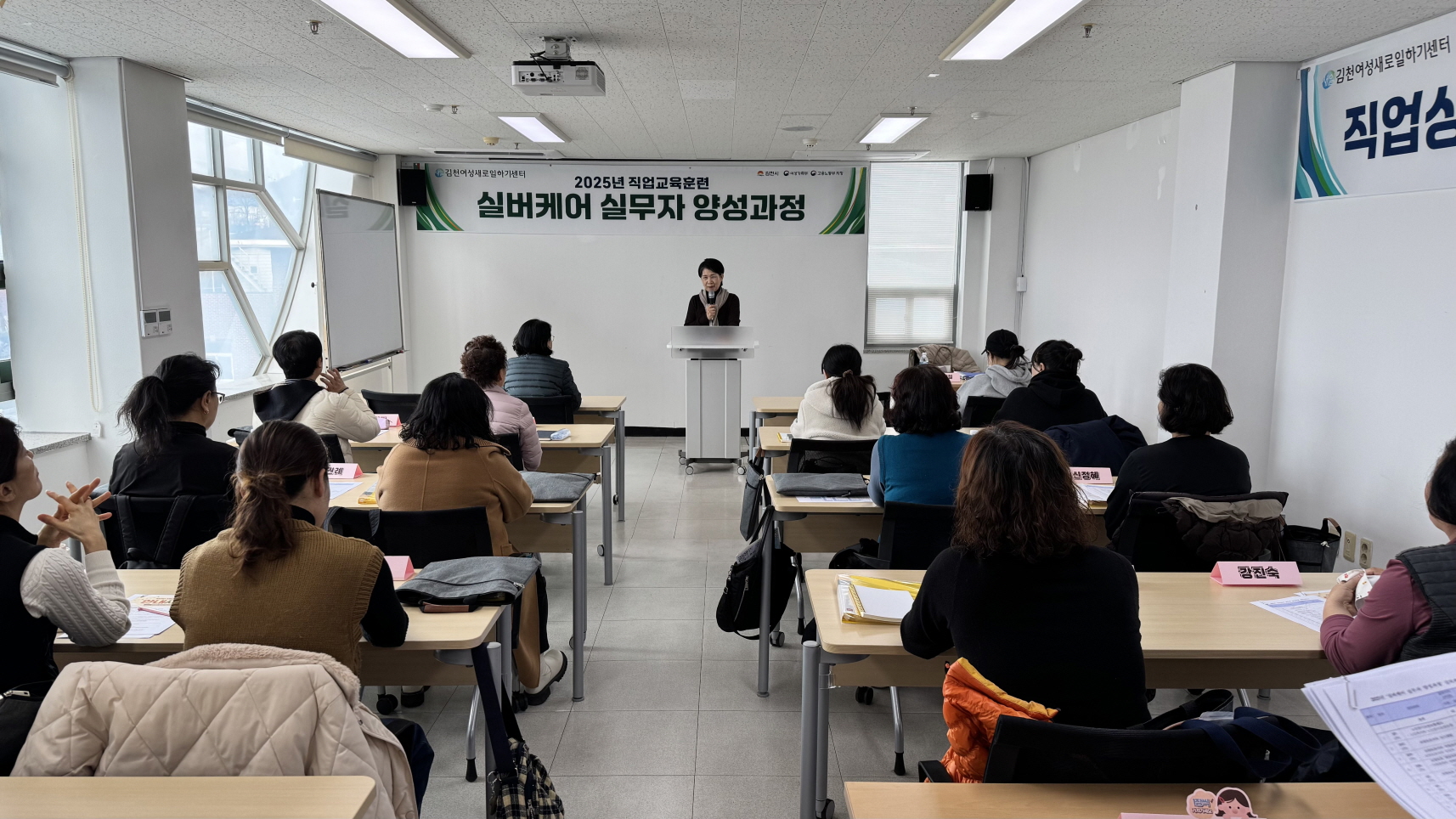 | 김천시 평생교육원 여성새로일하기센터에서는 3월 5일 취업 희망 여성 60명을 대상으로 직무능력 향상을 위한 직업교육훈련 「직업상담사 2급 자격취득 과정」, 「실버케어 실무자 양성 과정」, 「(전문기술)생산관리 사무원 양성 과정」 세 과목을 개강했다.