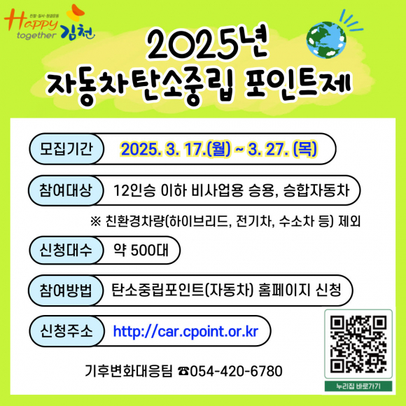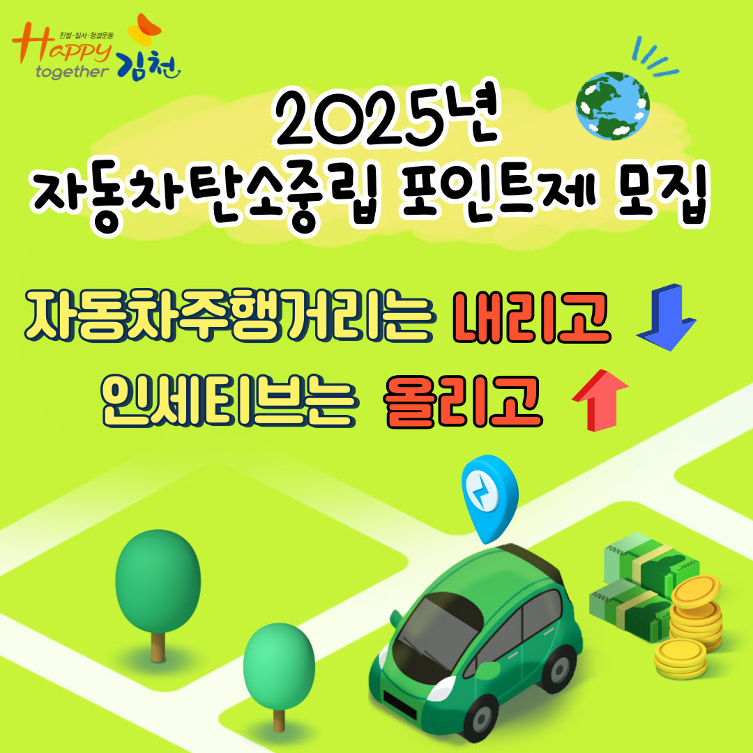 | 김천시는 운전자가 자동차 주행거리를 줄여 온실가스를 감축할 경우 주행거리 감축 실적에 따라 인센티브를 지급하는 ⌜2025년 자동차 탄소중립포인트제⌟ 참여 차량을 3월 17일부터 3월 27일까지 선착순 500대 모집한다.