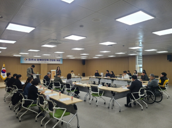 | 김천시는 지난 3월 6일 김천시장애인회관에서 장애인 복지 증진을 위해 지역 내 장애인단체 대표들과 간담회를 개최했다. 이번 간담회에는 김천시 사회복지과 관계자와 유형별・목적별 장애인단체 대표 및 종사자 등 30여 명이 참석하여 지역 내 장애인 지원방안에 대해 심도 있는 논의를 진행했다.