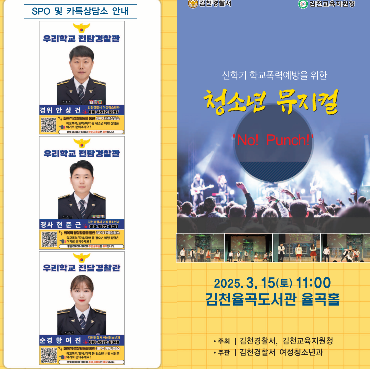 | 김천경찰서는 김천교육지원청과 협업하여 오는 3월 15일 11시 김천율곡도서관 율곡홀에서 약 450명의 김천 관내 학생 및 학부모를 대상으로 ‘NO PUNCH’ 학교폭력예방 뮤지컬 공연을 개최할 예정이다.