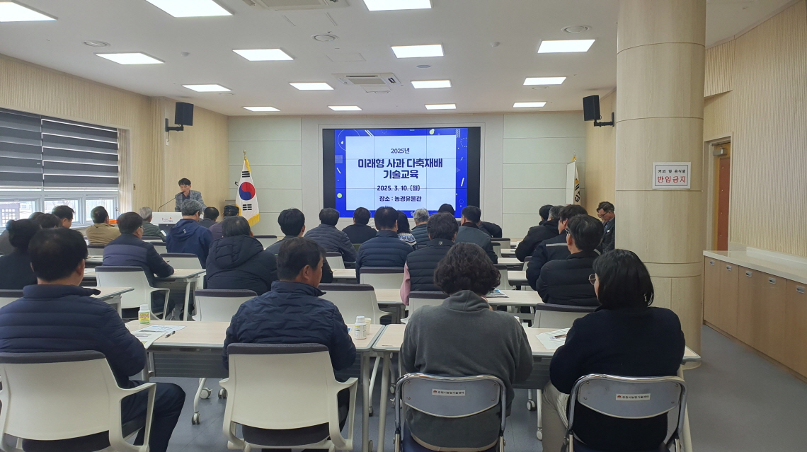 | 김천시 농업기술센터에서는 3월 10일 지역 사과 재배 농가의 경쟁력 강화를 위해 ‘2025년 미래형 사과 다축 재배 기술교육’을 실시했다.