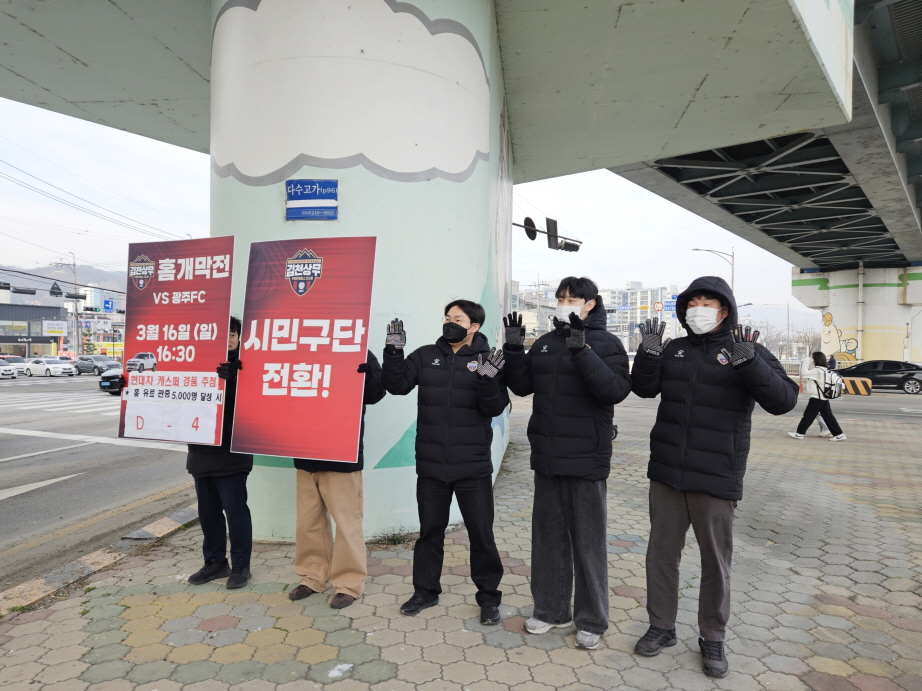 | 김천상무프로축구단(대표이사 이재하)이 지난 2월 17일부터 아침마다 김천시민에게 인사를 전하고 있다. 사무국 직원들이 직접 거리로 나서 출근하는 직장인과 자영업자, 등교하는 학생들에게 손을 흔들며 인사한다.