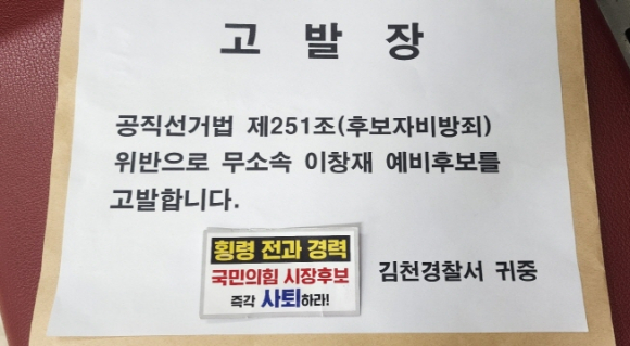 현재 이 사안은 경찰에 접수된 상태이며, 공직선거법 위반 여부에 대한 수사가 진행될 것으로 보인다.한편, 오는 4월 2일 치러지는 김천시장 재선거에는 국민의힘 배낙호 후보, 무소속 이선명, 이창재 후보, 더불어민주당 황태성 후보가 경쟁을 펼치고 있다. |