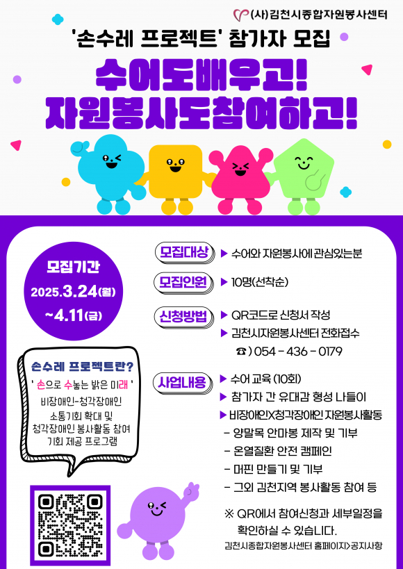 | 김천시종합자원봉사센터(센터장 김경희)는 경상북도에서 추진하는 2025 자원봉사 우수프로그램 개발 공모사업에 “손으로 수놓는 밝은 미래 – 손수레 프로젝트”라는 제목으로 신청, 선정되어 본 사업을 시행하게 되었다고 밝혔다. 이 사업은 의사소통의 어려움으로 인하여 사회참여기회가 다소 제한되는 청각장애인이 소외되지 않고 동등하게 사회활동에 참여할 수 있도록 수어교육을 통해 청각장애인과의 소통가능 인구를 증대하고, 청각장애인의 자원봉사활동 참여 기회를 제공하고자한다. 프로그램은 비장애인 참여자를 대상으로 한 수어교육을 시작으로 비장애인과 청각장애인이 함께 숲체험 및 줍깅활동, 양말목 안마봉 제작, 온열질환 예방 캠페인, 재능나눔활동, 머핀만들기, 무료급식소 봉사활동 등 다양한 지역사회 봉사활동에 참여하고 제작한 물품을 기부하는 것으로 마무리 될 예정이다. 본 사업을 통해 자원봉사활동은‘누구나’참여할 수 있으며, 장애인도 ‘봉사의 주체’가 될 수 있다는 인식을 지역사회에 확산시켜 장애인 포용적인 분위기를 구축하고 장애인의 사회참여가 활성화되는 김천이 되기를 기대한다. 사업 참여는 청각장애인과의 교류활동으로 의사소통의 벽을 허물고, 청각장애인에 대한 인식과 편견을 해소하고 싶은 김천시민이라면 자부담 없이 참여할 수 있다. 문의는 (사)김천시종합자원봉사센터(054-436-0179)로 하면된다. |