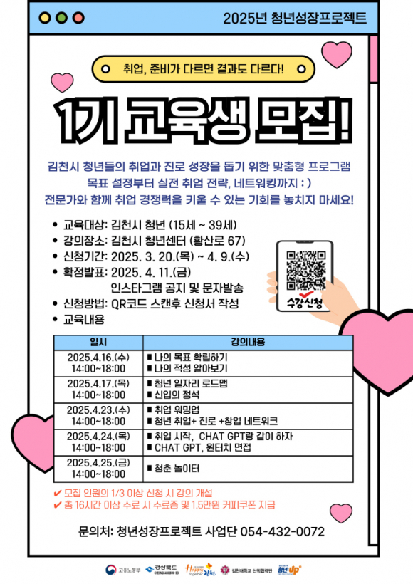| 김천대학교(총장 윤옥현) 산학협력단(단장 윤경식)은 ‘2025년 청년성장프로젝트’ 취업 교육 프로그램 1기 교육생을 모집한다고 3월 20일 밝혔다.
