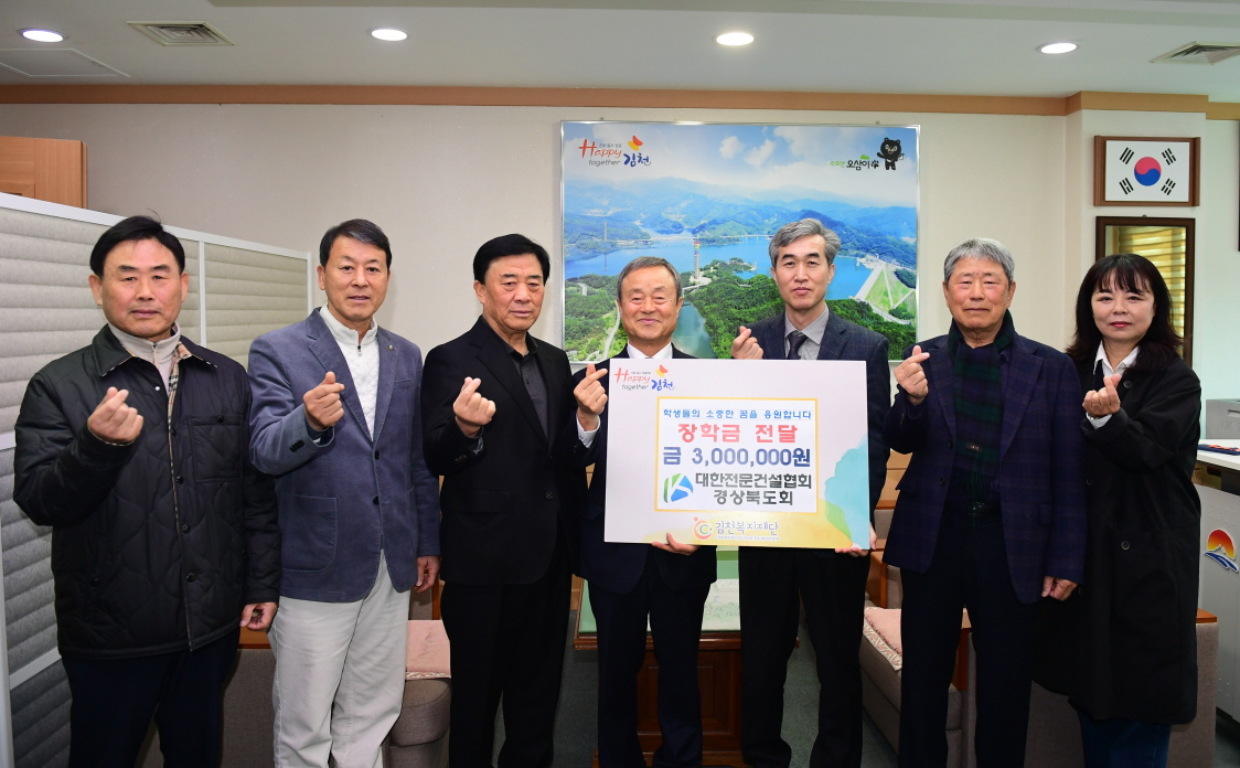 | 김천복지재단은 지난 3월 19일 대한전문건설협회 경북도회(회장 최진현)로부터 장학금 300만 원을 전달받았다고 밝혔다.
