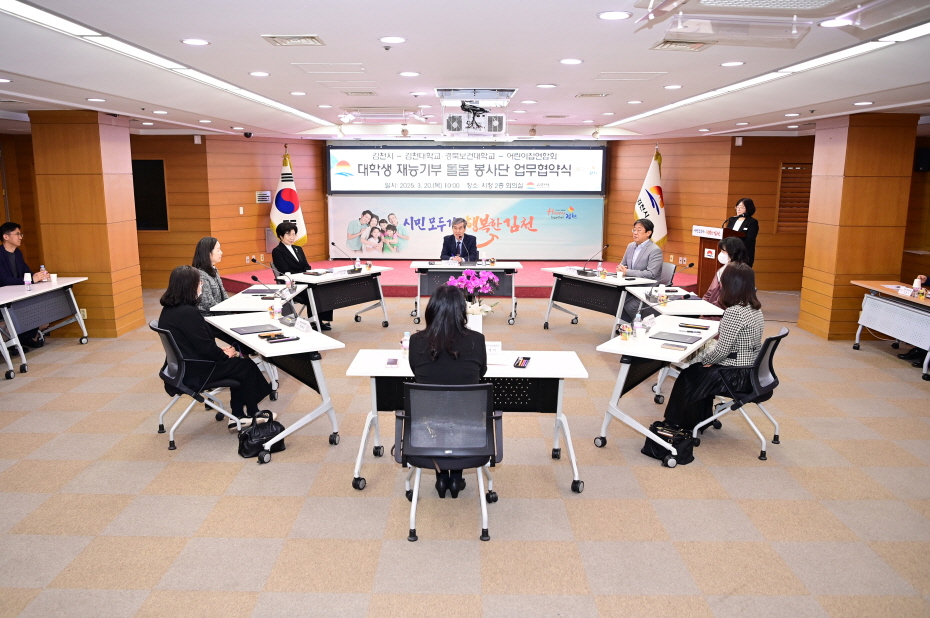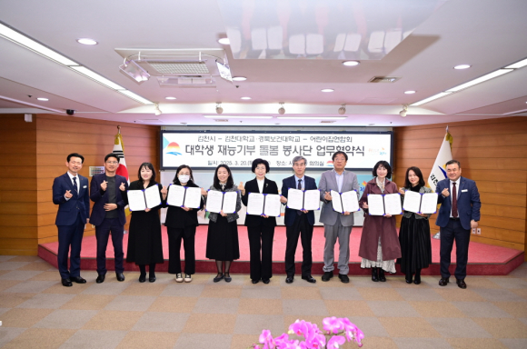 | 김천시(김천시장 권한대행 최순고 부시장)는 지난 3월 20일 시청 2층 회의실에서 김천대학교, 경북보건대학교, 각 어린이집 연합회와 함께 어린이집 돌봄 인력 지원을 위한 업무협약을 체결했다. 이 협약으로 대학생은 재능기부(자원봉사)를 통해 어린이집 돌봄 인력을 지원하고, 어린이집은 대학생들에게 다양한 실습 기회의 장을 제공할 예정이다.