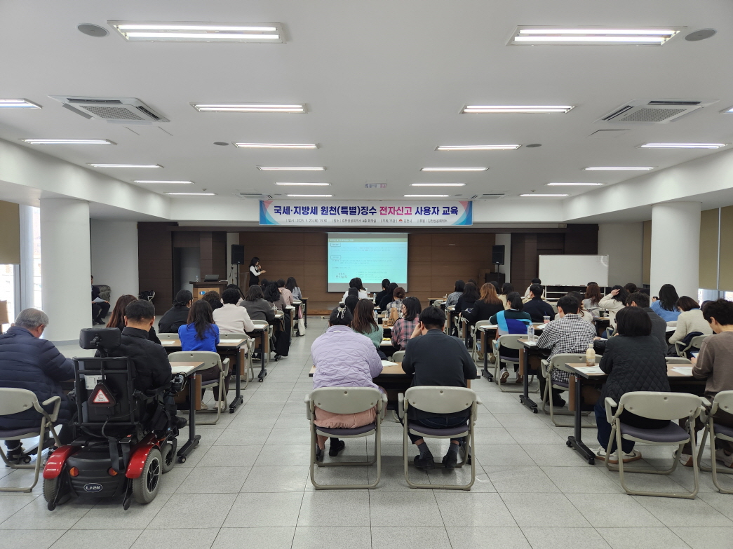 | 김천시는 지난 3월 20일 김천상공회의소 대회의실에서 소득세 및 지방소득세 원천징수(특별징수) 실무담당자 70여 명이 참석한 가운데 전자신고 사용자 교육을 실시했다.