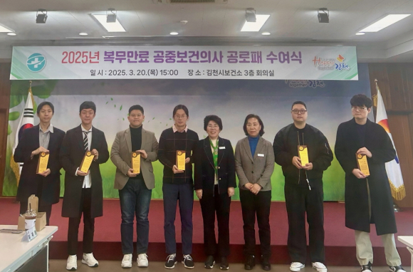 | 김천시는 3월 20일 김천시 보건소 3층 회의실에서 의료 취약지 주민 건강증진과 지역 의료 공백 해소에 큰 역할을 해준 2025년 복무 만료 공중보건의사에게 공로패를 수여했다. 공중보건의사는 농어촌 등 보건의료를 위한 특별조치법에 따라 읍면 보건지소 등에 배치되어 근무하며, 진료, 건강 상담 및 교육 등 공공보건의료 현장에서 다양한 임무를 적극적으로 수행해 지역 주민들의 건강 증진에 기여하고 있다. 이날 공로패를 받은 공중보건의사는 “지난 3년간 공중보건의사로 근무한 시간은 매우 뜻깊은 경험이었다.”라며, “앞으로 의료인으로서 사명감을 가지고 보건의료 서비스 수준을 향상하기 위해 더욱 노력하는 의사가 되겠다.”라고 말했다.