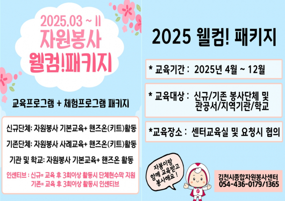 ‘웰컴! 패키지’는 김천시 신규 및 단체 자원봉사자들의 역량 강화를 통해 안정적이고 지속적인 자원봉사를 수행할 기술과 태도 능력을 향상시키는데 으뜸이라 할 수 있다. ` 2025년 본 사업에 관심이 있는 봉사자는 김천시종합자원봉사센터 (054-436-1365, 0179)로 우선 문의 후 프로그램에 참여하면 된다. |