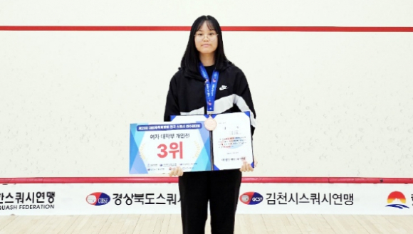 | 김천대학교(총장 윤옥현) 경찰소방학과(학과장 김봉수 교수)는 제21회 대한체육회장배 전국 스퀴시 선수권대회에 참가한 조예림(23학번) 학생이 3위에 입상하였다고 3월 25일 밝혔다.