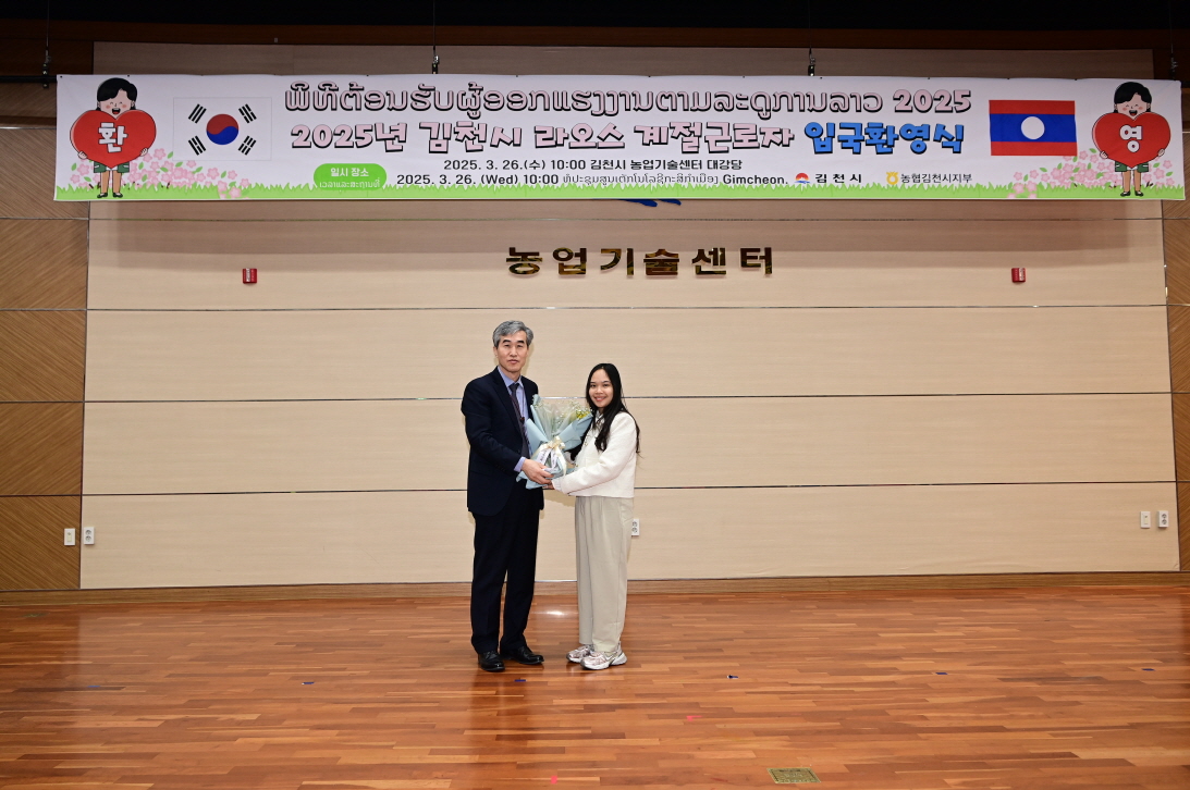 | 김천시(김천시장 권한대행 부시장 최순고)는 라오스 비엔티안에서 출발해 3월 24일 인천과 김해국제공항에 도착한 라오스 노동부 관계자와 계절근로자 80명이 참석한 가운데 26일 오전 10시 김천시 농업기술센터 1층 대강당에서 “2025년 라오스 계절근로자 환영식”을 개최했다고 밝혔다.
