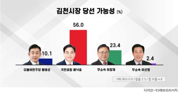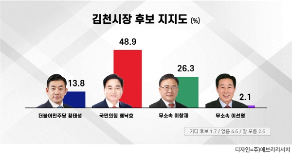 [경북정치신문=이관순 기자] ㈜뉴스코리아네트워크 의뢰로 에브리미디어리서치에서 지난 23일 24일 양일간 실시한 김천시장 재선거 여론조사에서 국민의힘 배낙호 후보가 48.9%로 더불어민주당 황태성 후보 13.8%, 무소속 이창재 후보 26.3%, 이선명 후보 2.1%를 차지했다. 투표 7일 남기고 실시 한 여론조사에서 국민의힘 배낙호 후보가 오차범위 밖 차이를 보이며 당선 가능성을 높이고 있다.