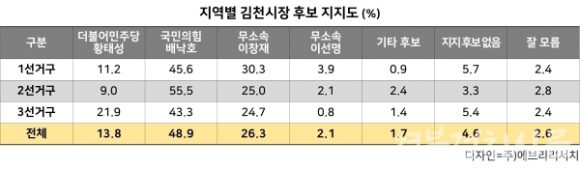 지역별 결과, 세 선거구 모두 국민의힘 배낙호 후보가 오차범위 밖으로 우세했다. 무소속 이창재 후보는 1선거구에서 30.3%, 민주당 황태성 후보는 3선거구에서 21.9%의 지지를 받았다.