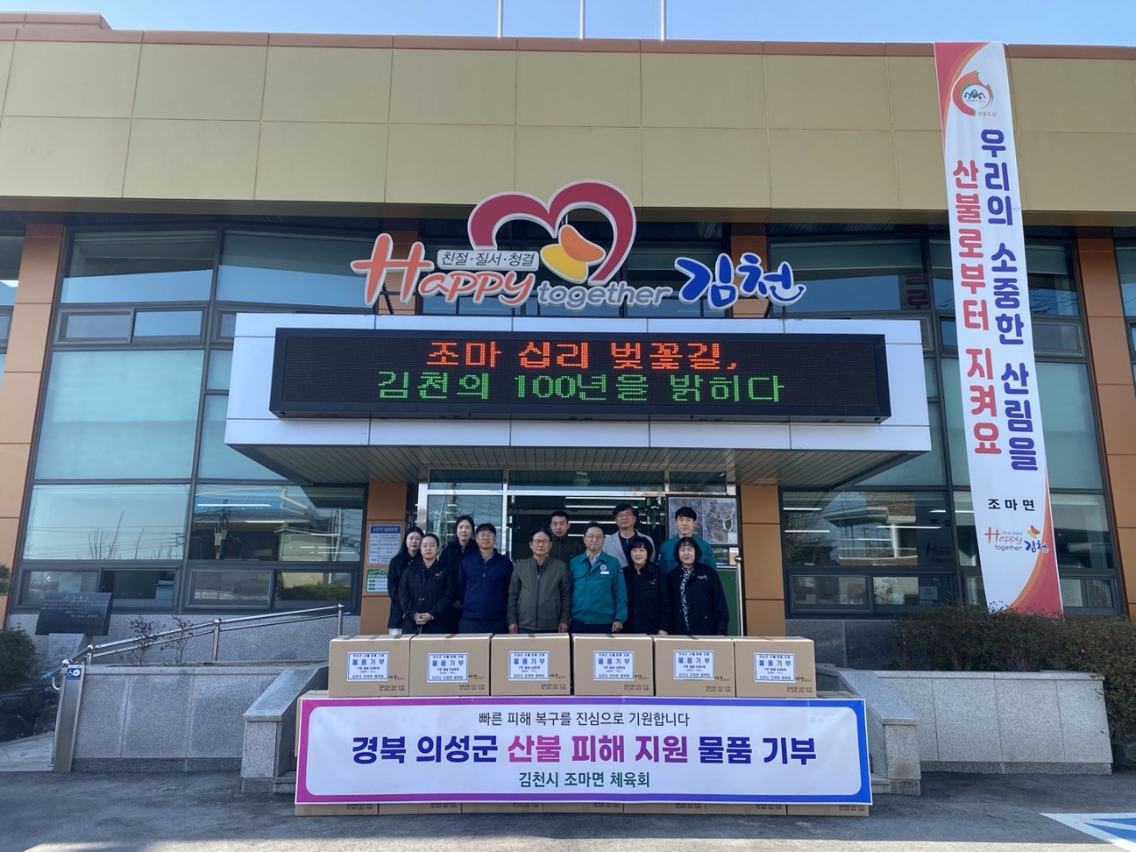 김천시 조마면(면장 김영백)은 산불 피해 지역의 아픔을 고려하여 ‘조마 십리 벚꽃길, 김천의 100년을 밝힌다.’라는 슬로건 아래 진행 예정이던 벚꽃 행사를 취소했다. 대신 ‘조마 십리 벚꽃길, 경북의 100년을 밝힌다.’라는 의미를 새롭게 담아, 피해 지역과의 연대와 나눔을 실천하는 계기로 삼았다.