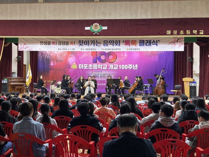 | 아포초등학교(교장 임병록)는 4월 1일 아포초등학교 강당에서 학생과 교직원, 학부모를 대상으로 경상북도 도립교향악단 초청 공연인 ‘톡톡 클래식’을 실시하였다.