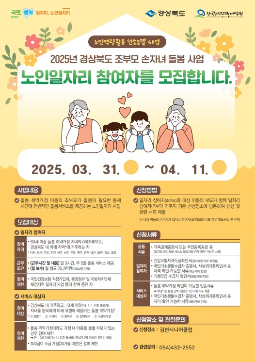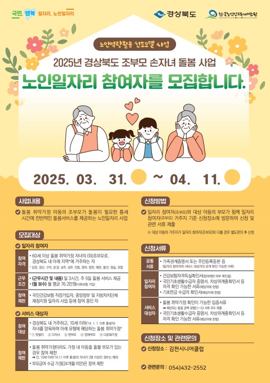 김천시 관계자는 “이번 사업을 통해 지역 어르신의 사회 참여 기회를 확대함과 동시에 돌봄 공백 가정에 부담을 덜어주는 일거양득의 효과를 낼 수 있기를 기대한다.”라고 했다.