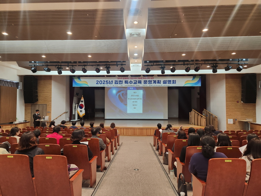 | 경상북도김천교육지원청(교육장 모태화)은 4월 3일 김천학생문화예술센터에서 관내 유·초·중·고등학교 특수교사 및 특수교육 업무담당자 70명을 대상으로 ‘2025 김천 특수교육 운영계획 설명회’를 개최하였다.