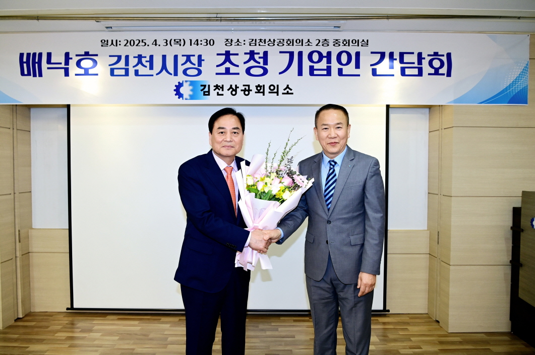 | 배낙호 김천시장은 4월 3일 김천상공회의소에서 지역 주요 기업인들과 간담회를 가졌다.