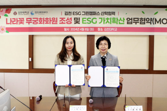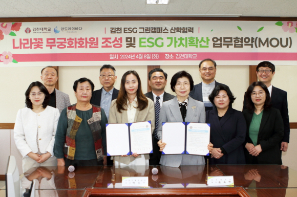 | 김천대학교(총장 윤옥현)는 ㈜안드레바다(대표 백송이)와 함께 무궁화 조성과 ESG(환경·사회·지배구조) 가치 확산을 위한 업무협약(MOU)을 체결했다고 4월 10일 밝혔다.