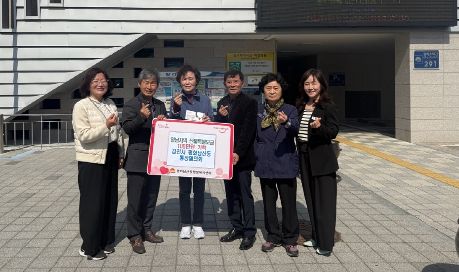 | 김천시 평화남산동 통장협의회(회장 고진석)는 지난 4월 8일 평화남산동 행정복지센터를 방문해 영남 지역 산불 피해 복구를 위한 성금 일백만 원을 전달했다. 이번 성금은 영남 지역 산불로 삶의 터전을 잃고 실의에 빠진 주민들의 어려움을 함께 나누기 위해 상반기 통장협의회 선진지 견학을 위해 조성된 경비 전액으로 마련됐다.