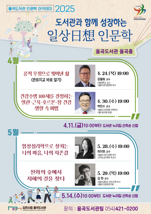 「율곡 인문학 클래스」 참가 신청은 4월 11일 오전 10시부터 도서관 누리집에서 선착순으로 진행되며, 관련 문의는 김천시립도서관 율곡도서관팀(☎421-0200)으로 하면 된다. |